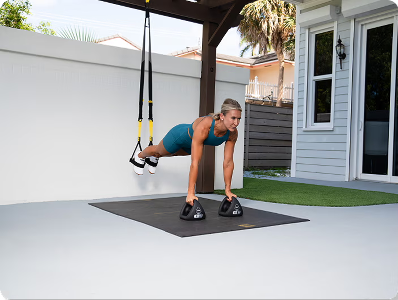 Adjust the difficulty of any movement by changing your body position. The more you lean into the straps, the more of your bodyweight you lift. Step back to increase intensity, step forward to reduce it—no weight plates required.