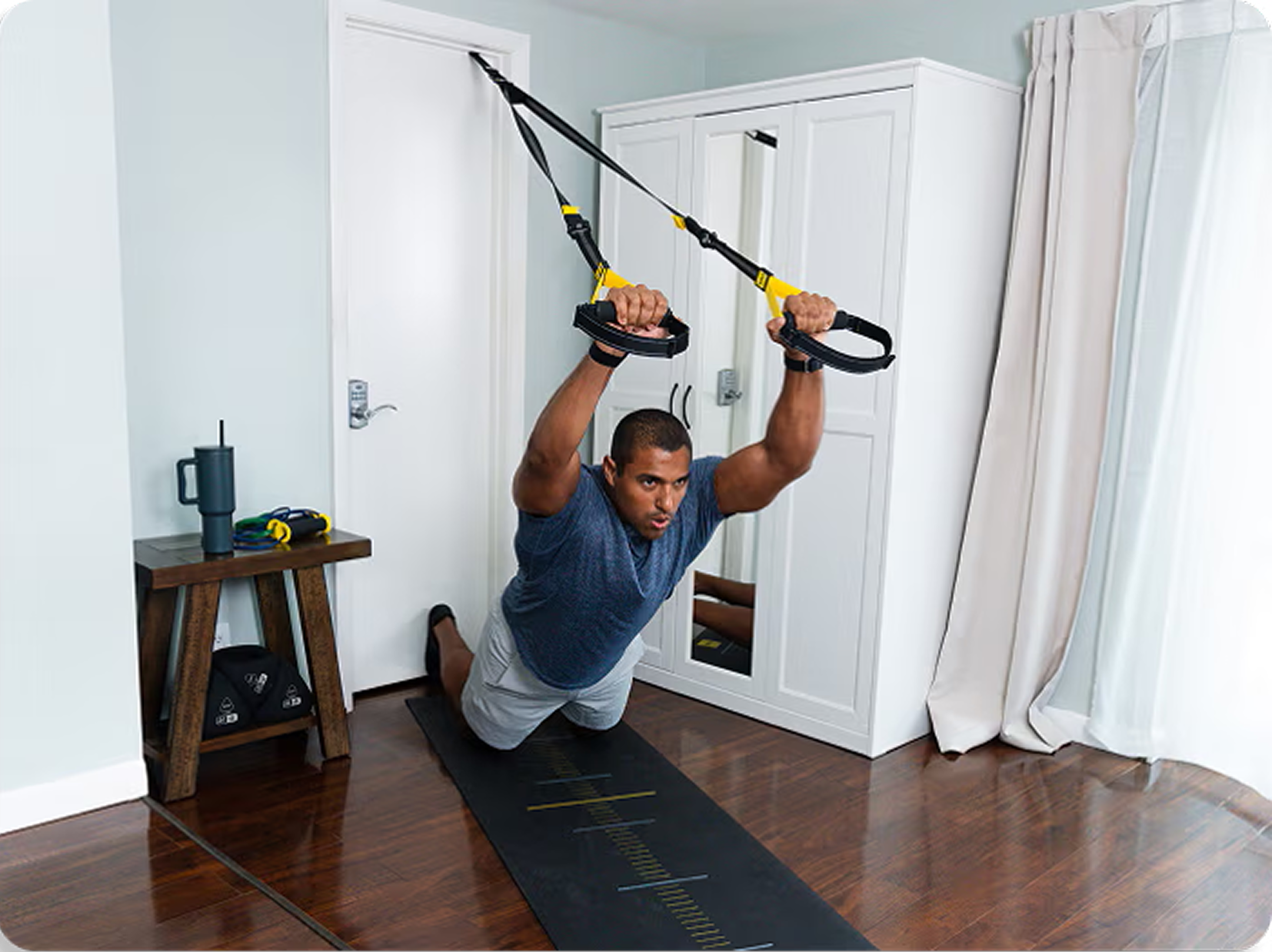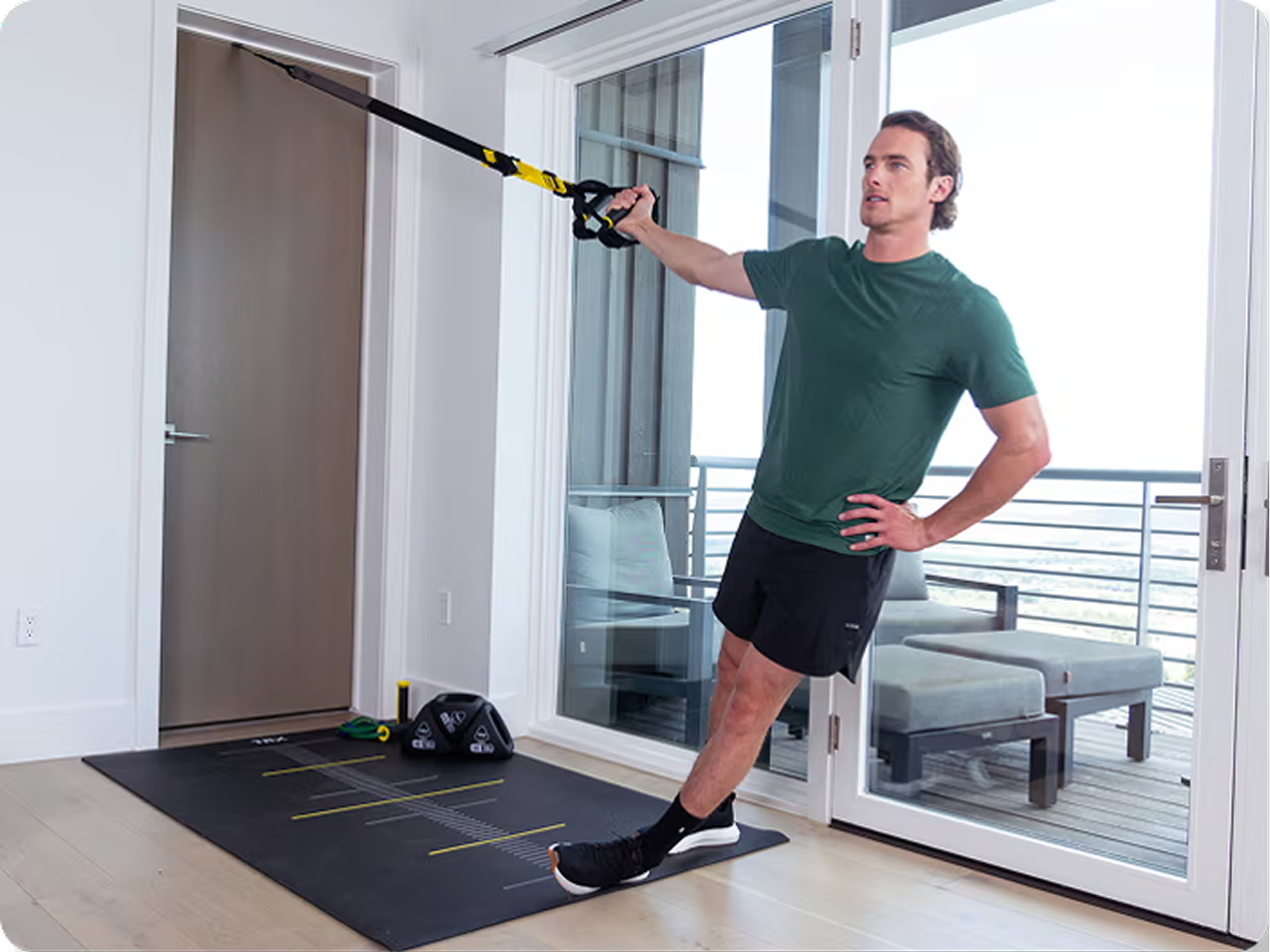 Very little. Most workouts require only enough space to extend your body length behind the anchor point (about 6–8 feet)—perfect for apartments, hotel rooms, or spare bedrooms.